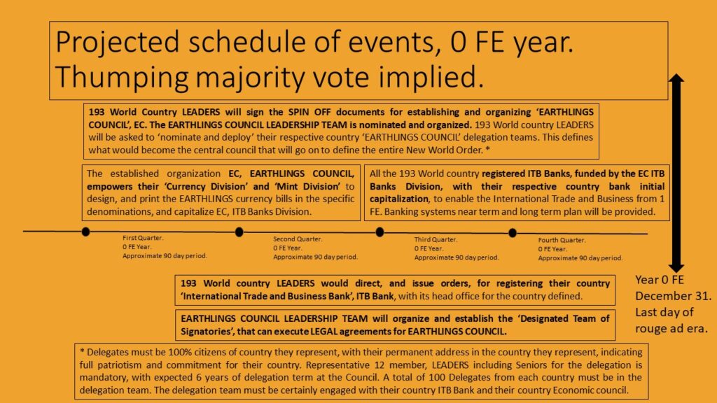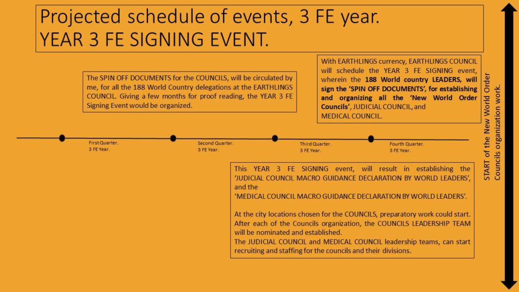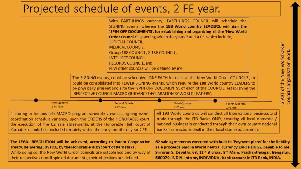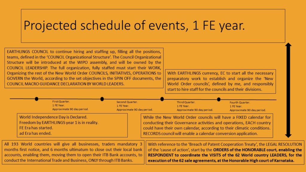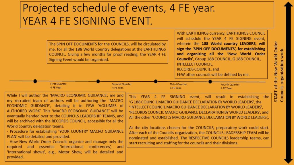 THESE ARE THE FOUR YEARS MACRO PROGRAM PROJECTED SET OF EVENTS, FOR MY INTRODUCTION OF AND TAKING PROJECT EARTHLING© LIVE, AND ORGANIZING ‘EARTHLINGS COUNCIL’, EC.